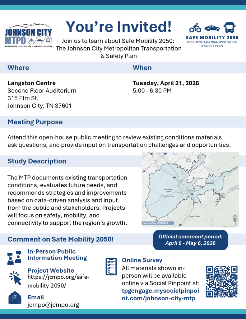 The Johnson City Metropolitan Transportation Planning Organization (MTPO) will host a public information meeting on Tuesday, April 21, 2026, to gather community input on the Safe Mobility 2050: The Johnson City Metropolitan Transportation & Safety Plan. The meeting will take place from 5:00 to 6:30 p.m. at the Langston Centre, Second Floor Auditorium (315 Elm St, Johnson City, TN 37601).